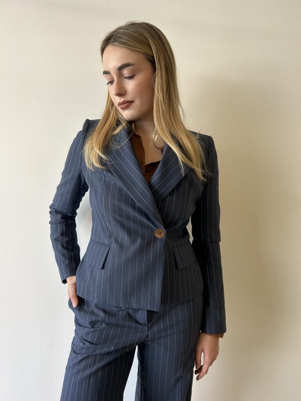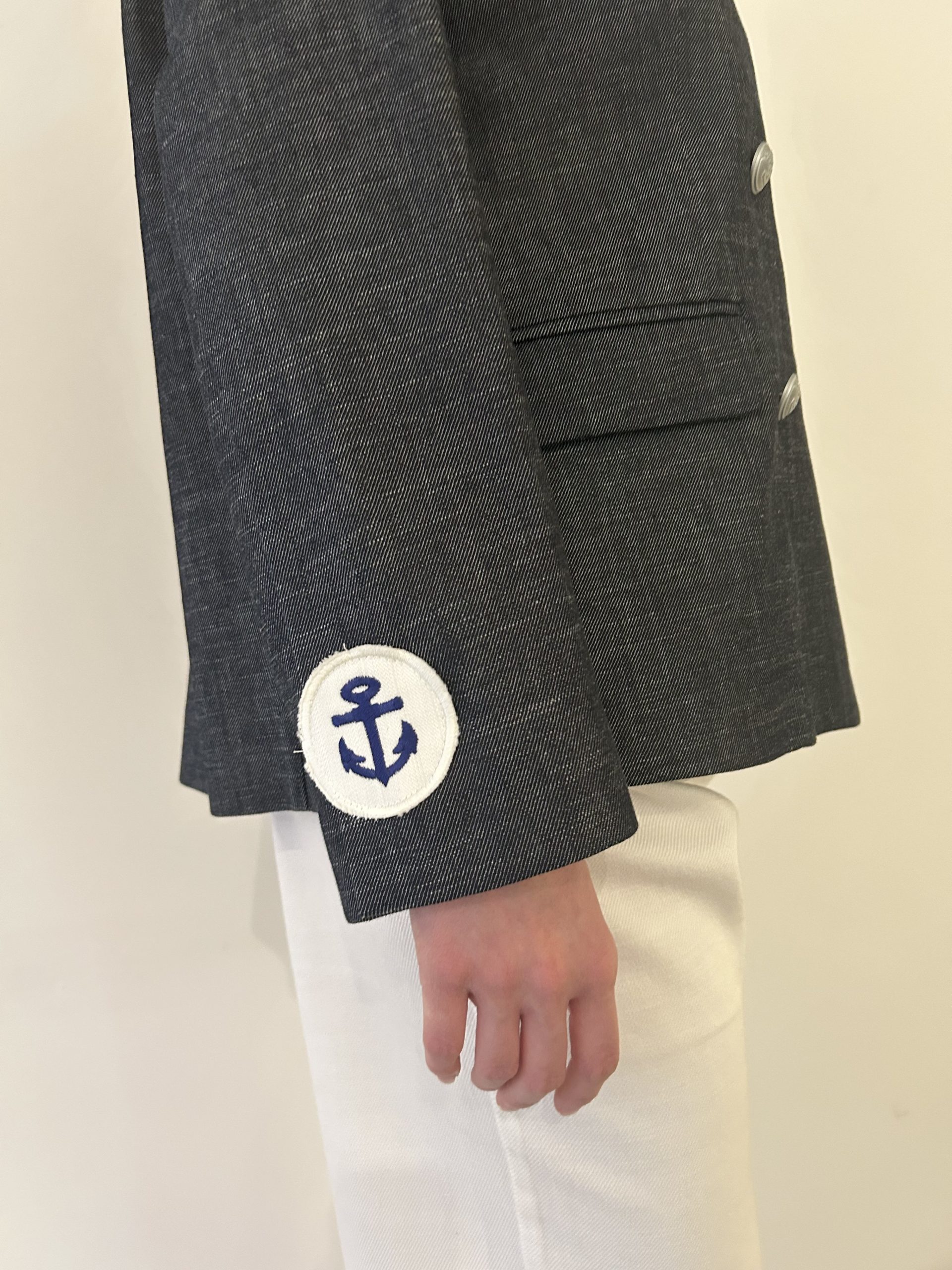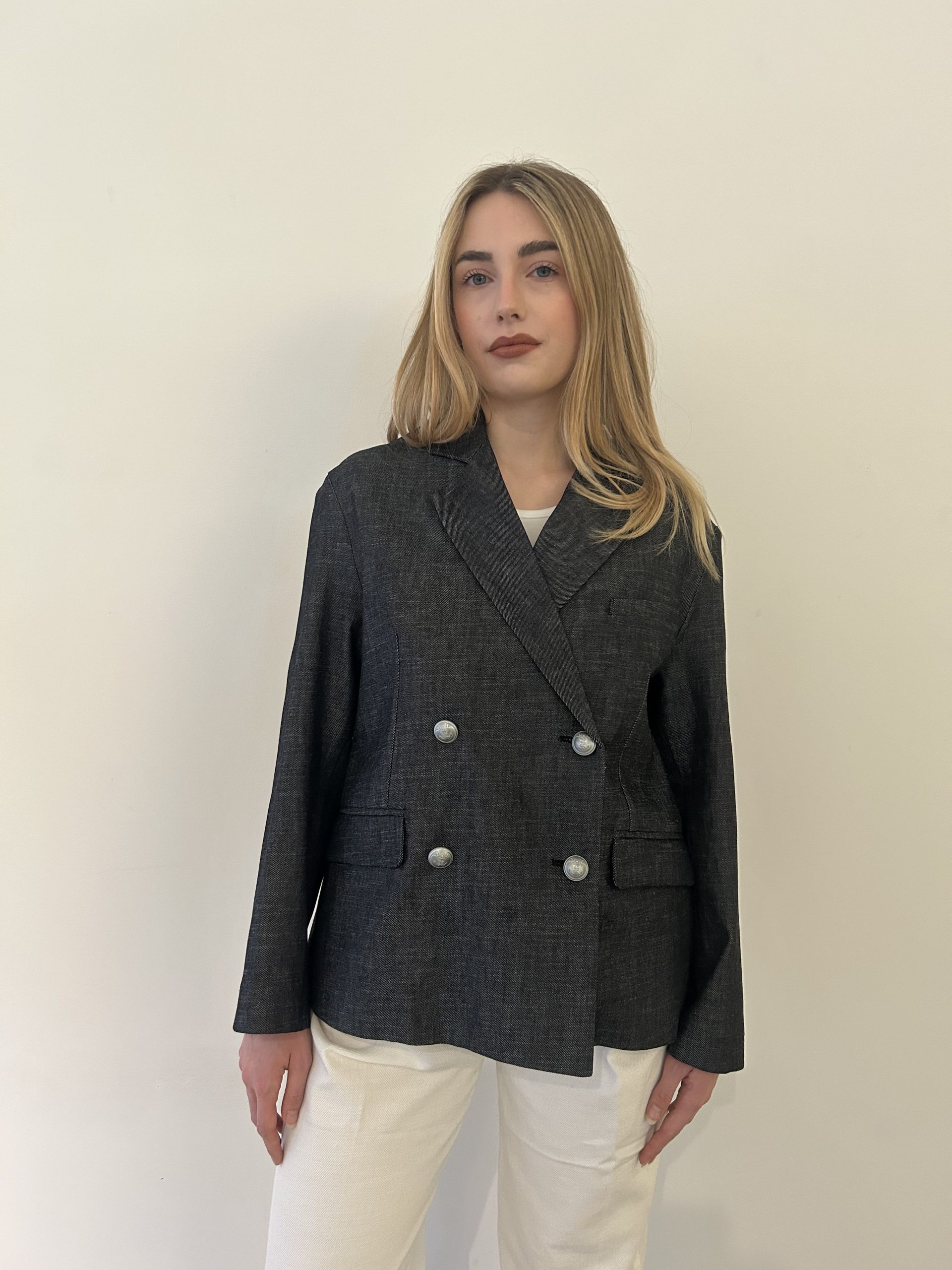 Giacca doppiopetto in tela jeans cruda. Vestibilità regolare.