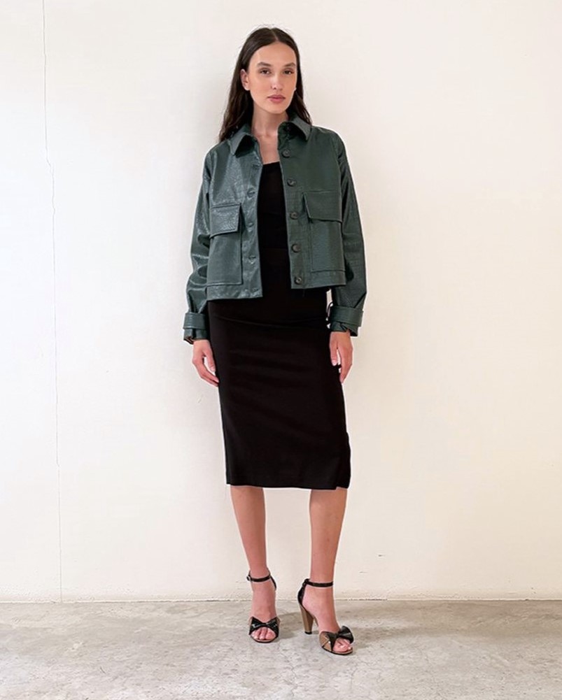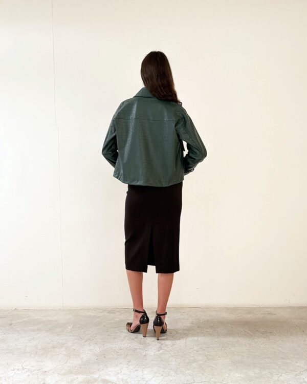 Overshirt in ecopelle foderata con stampa cocco. Buona vestibilità.