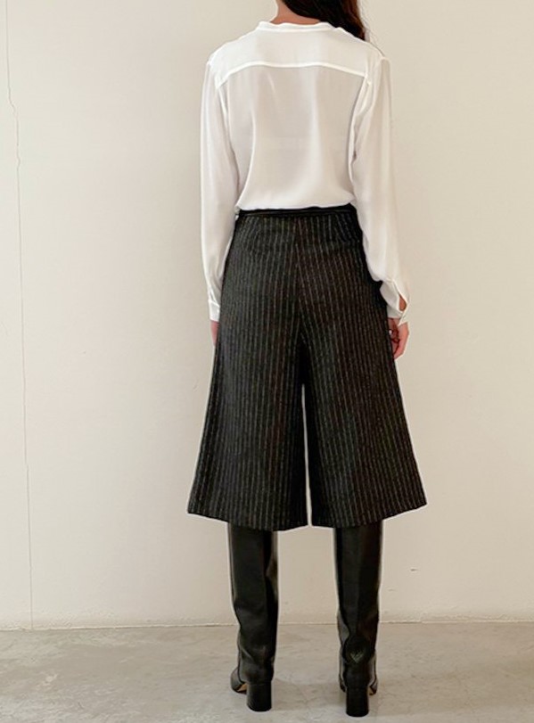 Pantalone cropped gessato con pences. Vestibilità regolare.